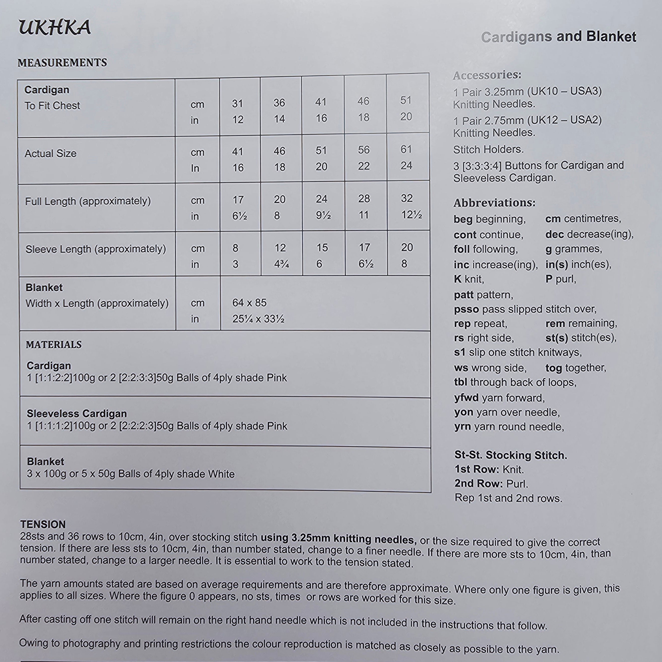 Needles: Straight Needles: 2.75mm & 3.25mm.