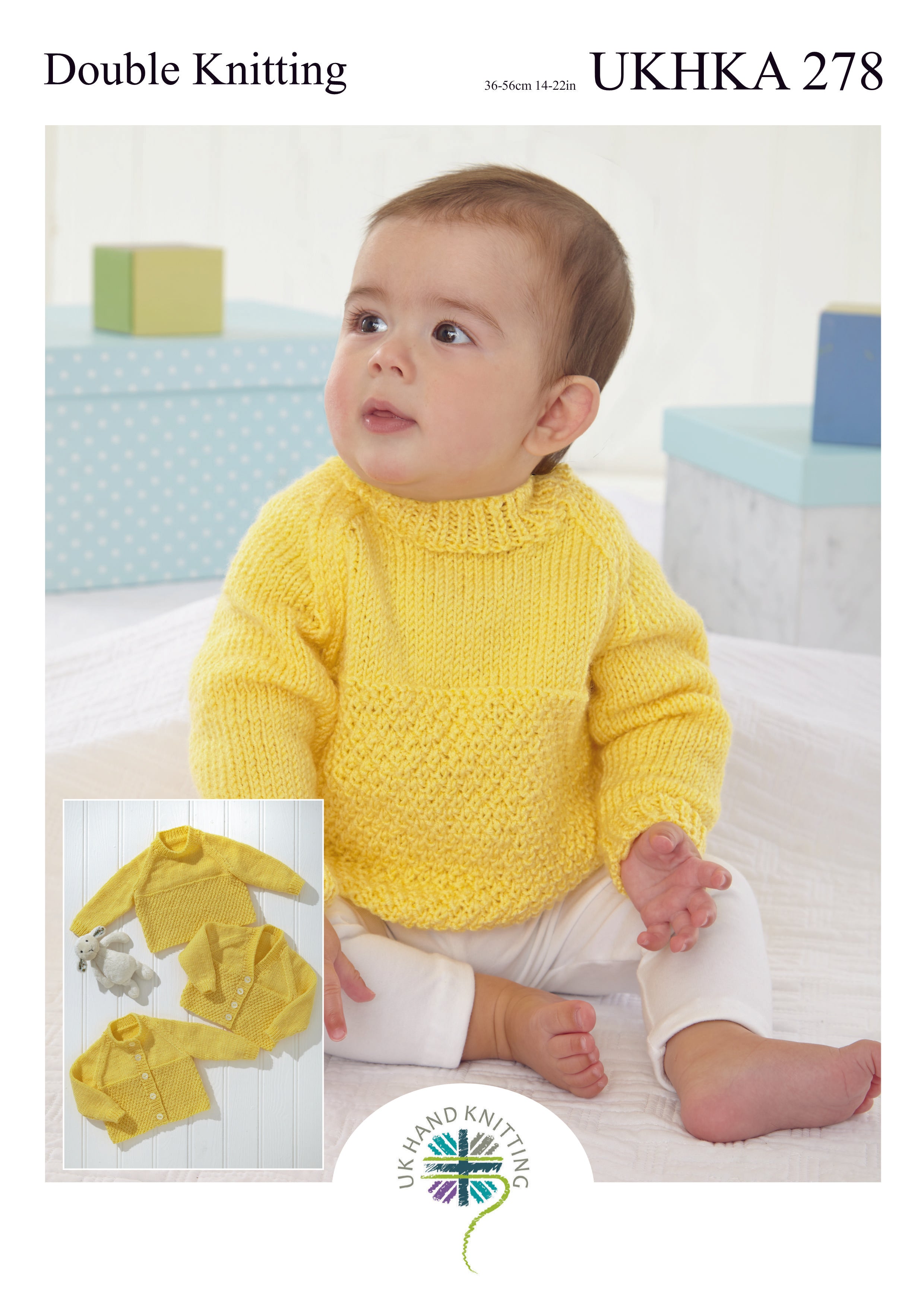 This leaflet includes 3 patterns including 2 cardigans (round and v-neck) and a sweater with an Irish moss stitch design.