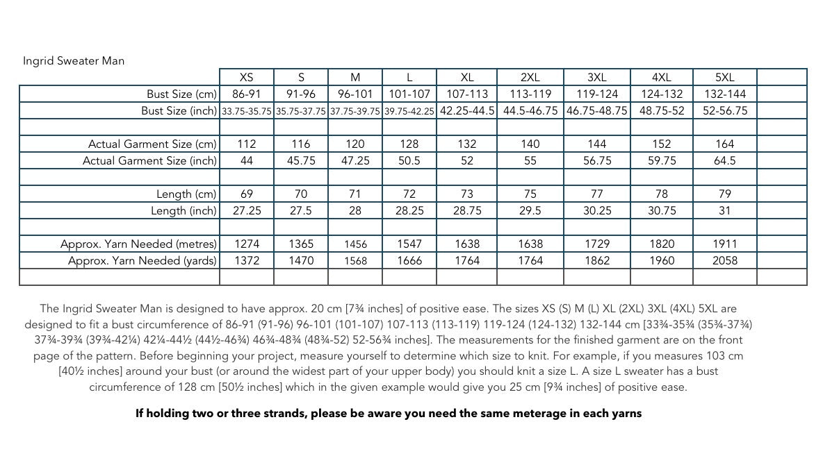 he Ingrid Sweater Man is worked from the top down in a knit and purl texture pattern. First, the back yoke is worked back and forth and the sloping shoulders are shaped using short rows. Then stitches are picked up and knitted for the shoulder sections, which are worked separately and then joined to form the front yoke. The front and back yoke are joined at the underarms to form the body, which is worked straight down in the round. The sleeves are knitted in the round from stitches that are picked up and knitted along the armholes. A rib neck edge is worked, folded double and knitted together. The Ingrid Sweater Man is worked in a texture pattern, which consists of three different pattern sections.