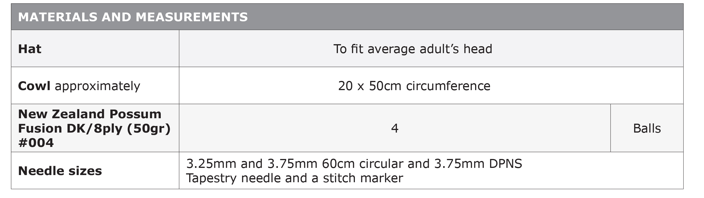 The amount of balls you will need depends on how many meters there are in a ball. The New Zealand Possum Fusion DK has 104m in a 50g ball, so please take this into consideration when buying yarn for this pattern.